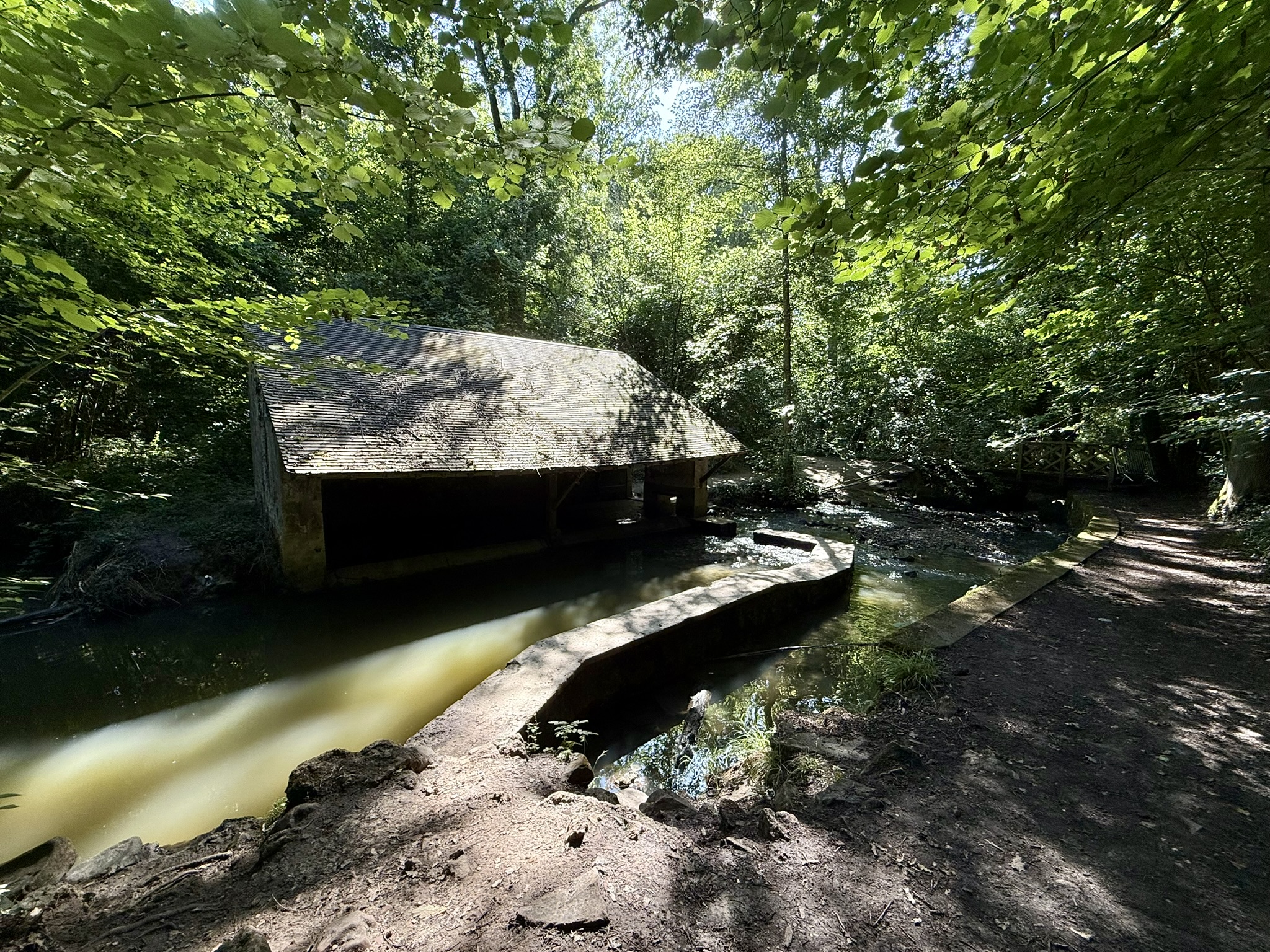 Par où donc passer ? Une rapide réflexion m’amène à passer par le parapet qui traverse l’eau, puis à passer par l’intérieur de la bâtisse. Obstacle passé, je peux continuer ma route !