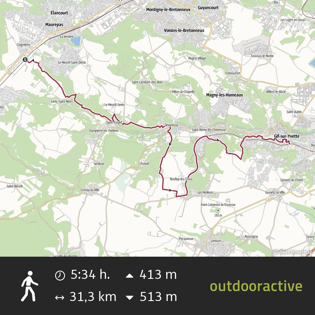 Et après un peu plus de 5h30 de marche, 6h30 toutes pauses confondues, et plus de 31 km, me voici enfin arrivé à mon terminus, la gare de Gif sur Yvette. Objectif atteint ! Avec en prime un bonus dénivellation (+413/-513 mètres, le point d’arrivée étant plus bas que le point de départ), et un autre pour la vitesse (5,7 km/h de moyenne). Et un dernier pour avoir battu mon record de la randonnée la plus longue réalisée depuis que je les mesure (2012), d’un peu plus de 1 km (tient, c’est précisément l’extra qui n’était pas prévu au départ… il aura eu son utilité !).