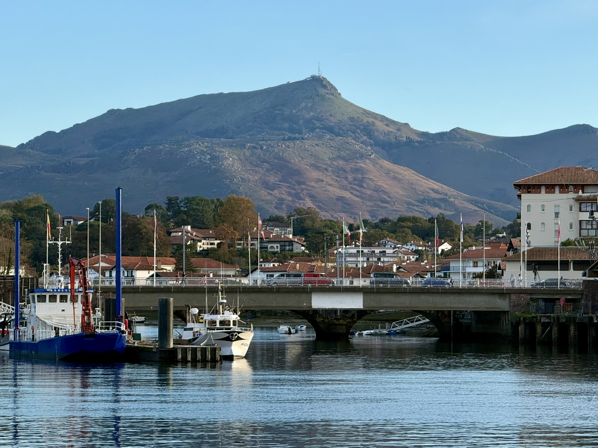 Retour à Saint Jean de Luz en TER en même pas 10 minutes, puis après un temps passé à l’hôtel, je reprends la direction du centre ville pour en faire une découverte un peu plus approfondie. Je découvre une bien jolie ville, assez animée dans ses artères commerçantes. Le passage au port me permettra de prendre en photo le sommet emblématique de la région, la Rhune, qui domine le décor du haut de ses modestes 900 mètres d’altitude.