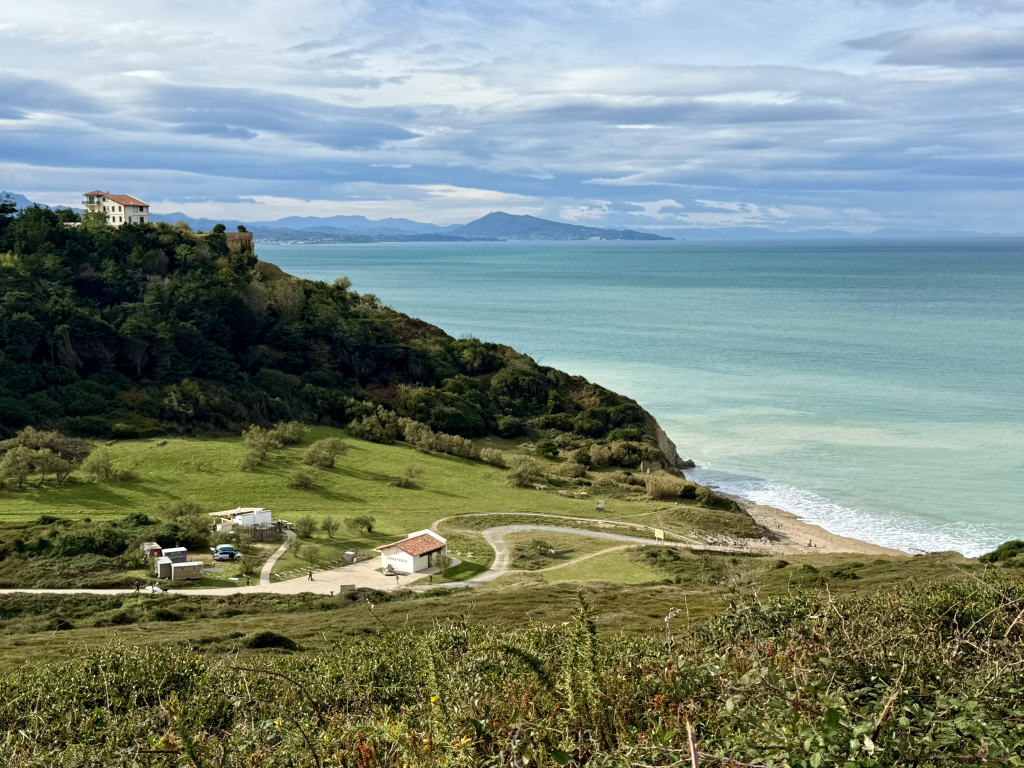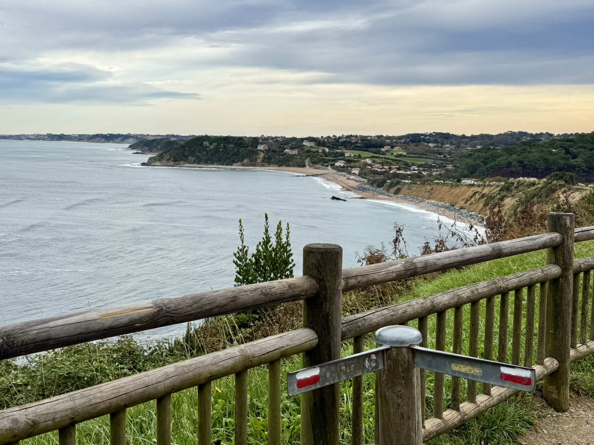 Une randonnée qui a commencé avec un temps très doux, mais très nuageux à couvert, et un vent sensible, que j’aurai heureusement le plus souvent dans le dos. Le début se passe de plages en plages, ca monte et ca redescend assez régulièrement, car oui, la côte basque n’est pas toute plate, les Pyrénées ne sont pas loin, et jusqu’à Biarritz il y a de nombreuses collines.