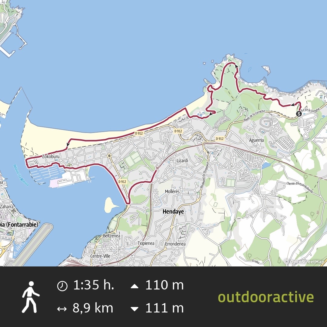 La fin de la randonnée, longeant le port et la baie de Chingoudy, avant de remonter à la gare de Hendaye – Les 2 Jumeaux, est moins intéressante. Au final, une bonne mise en jambes de près de 9 km, dont voici le parcours :