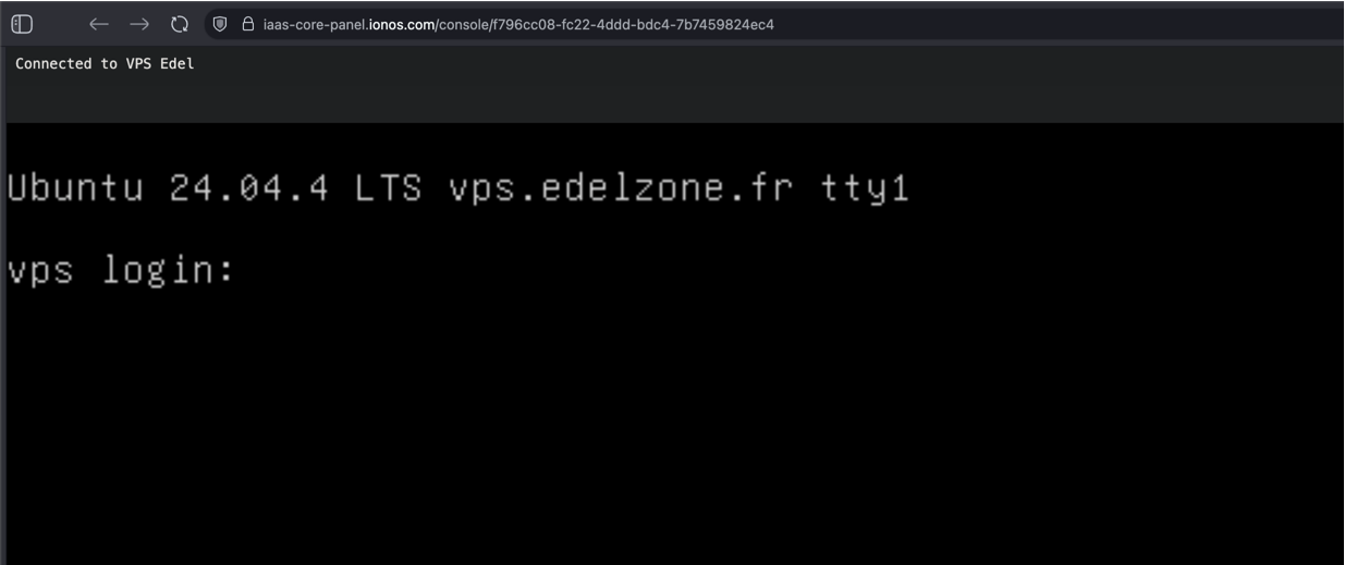 Et bien je commence par aller sur l’interface de gestion du serveur chez le fournisseur IONOS, qui va me permettre d’installer un système d’exploitation en mode console, sans interface graphique (donc là, Linux Ubuntu Server). Puis, à la fin de l’installation, heureusement entièrement automatisée, y compris pour la mise en réseau, l’interface me permet de me connecter au serveur via une console minimaliste, mais qui va me permettre d’avancer.