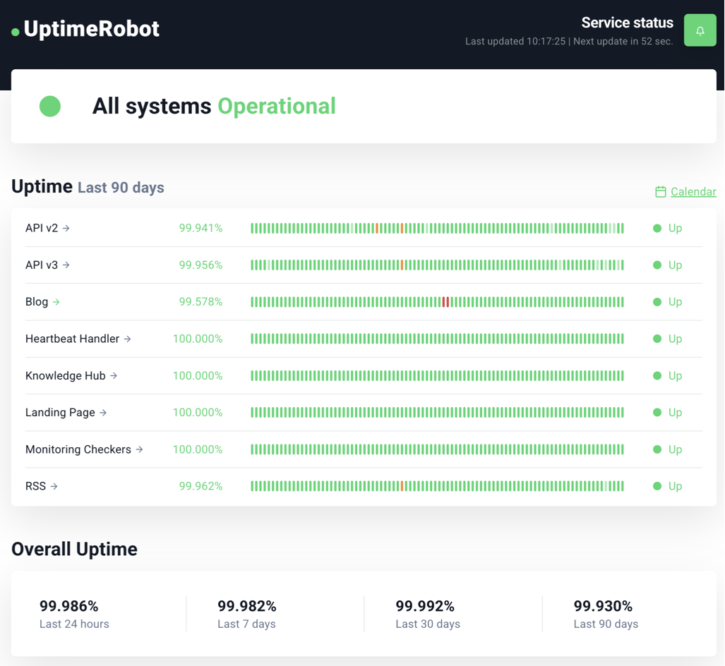 L’interface web d’UptimeRobot, qui présente les indicateurs de disponibilité de chacun des services surveillés (image d’illustration)